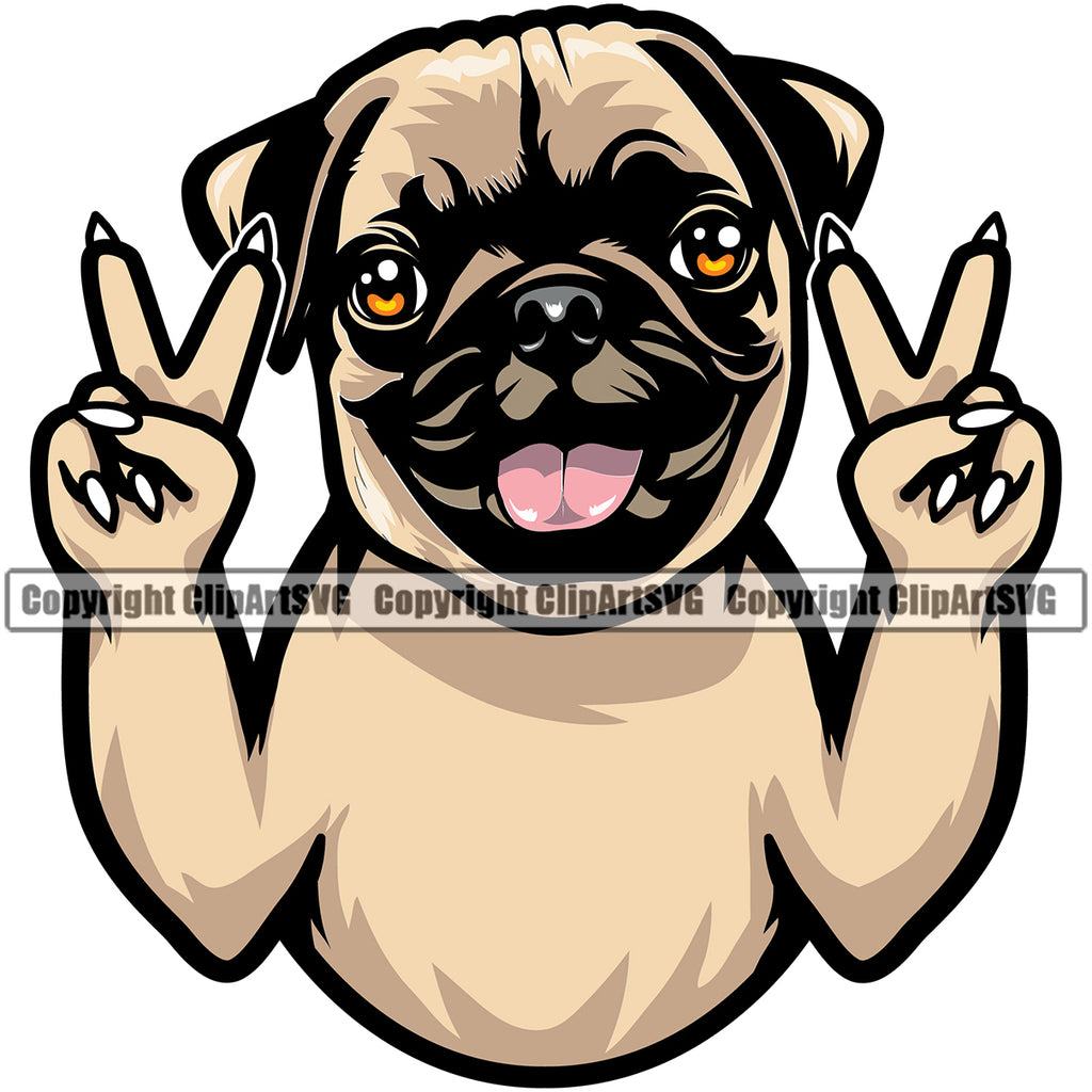 Pug Dog Peace Hand Sign Color Head Design Element Puppy Pup Head K-9 K9 Animal Portrait Doggy Face Purebred Pedigree Canine Clipart SVG