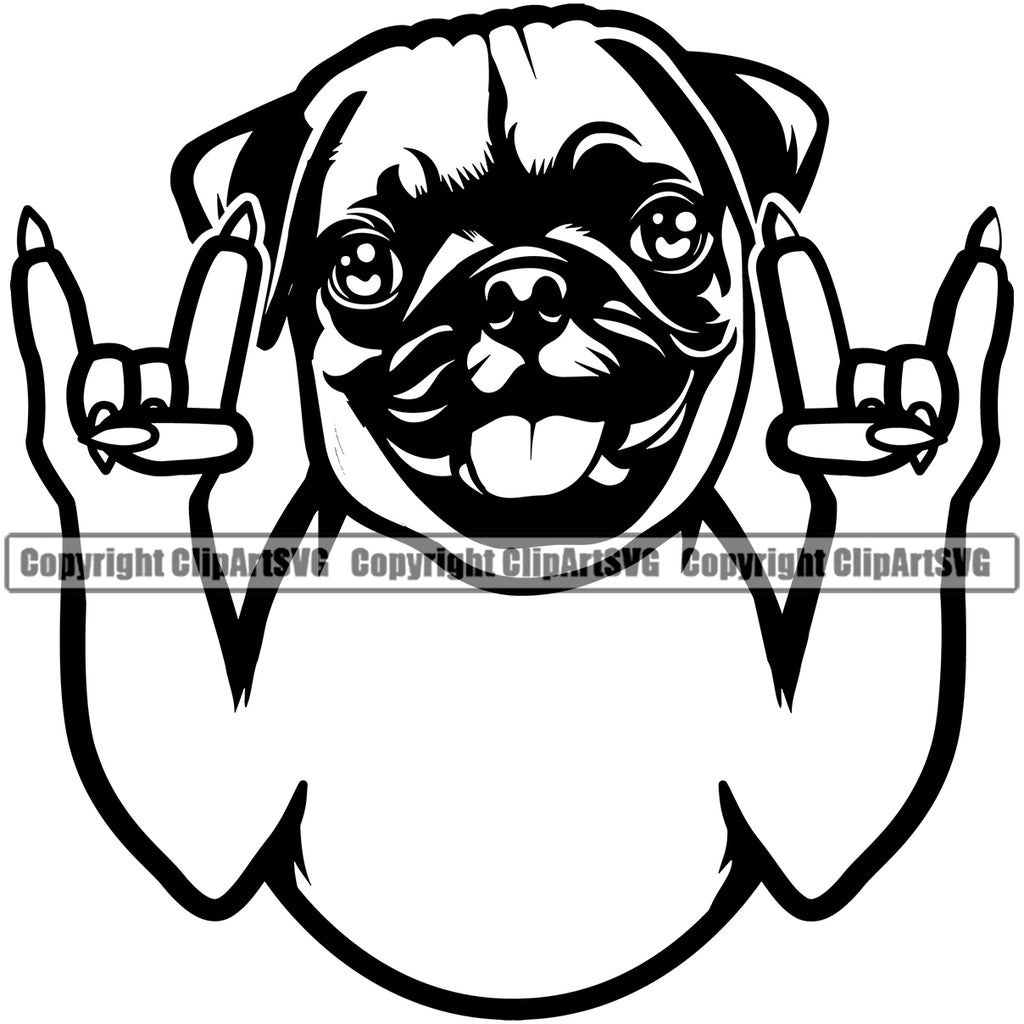 Pug Dog Rock And Roll Hand Sign Smile Face Animal Deign Puppy Pup Head Purebred Pedigree Doggy Canine K-9 K9 Animal Portrait Clipart SVG
