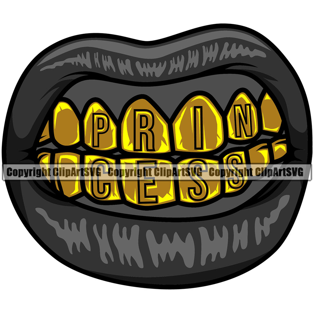 Lips Gold Teeth Princess Text Design Element Woman Female Girl Lady Sexy Mouth Position Head Cartoon Character Mascot Creation Create Art Artwork Creator Business Gangster Grill Thug Mean Mug Bling Jewelry Company Logo Clipart SVG